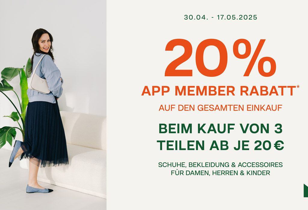 Spare bis zum 17.05. 20 %* als App-Member beim Kauf von 3 Teilen ab je 20 €. Egal ob Schuhe, Bekleidung oder Accessoires für Damen, Herren und Kinder.