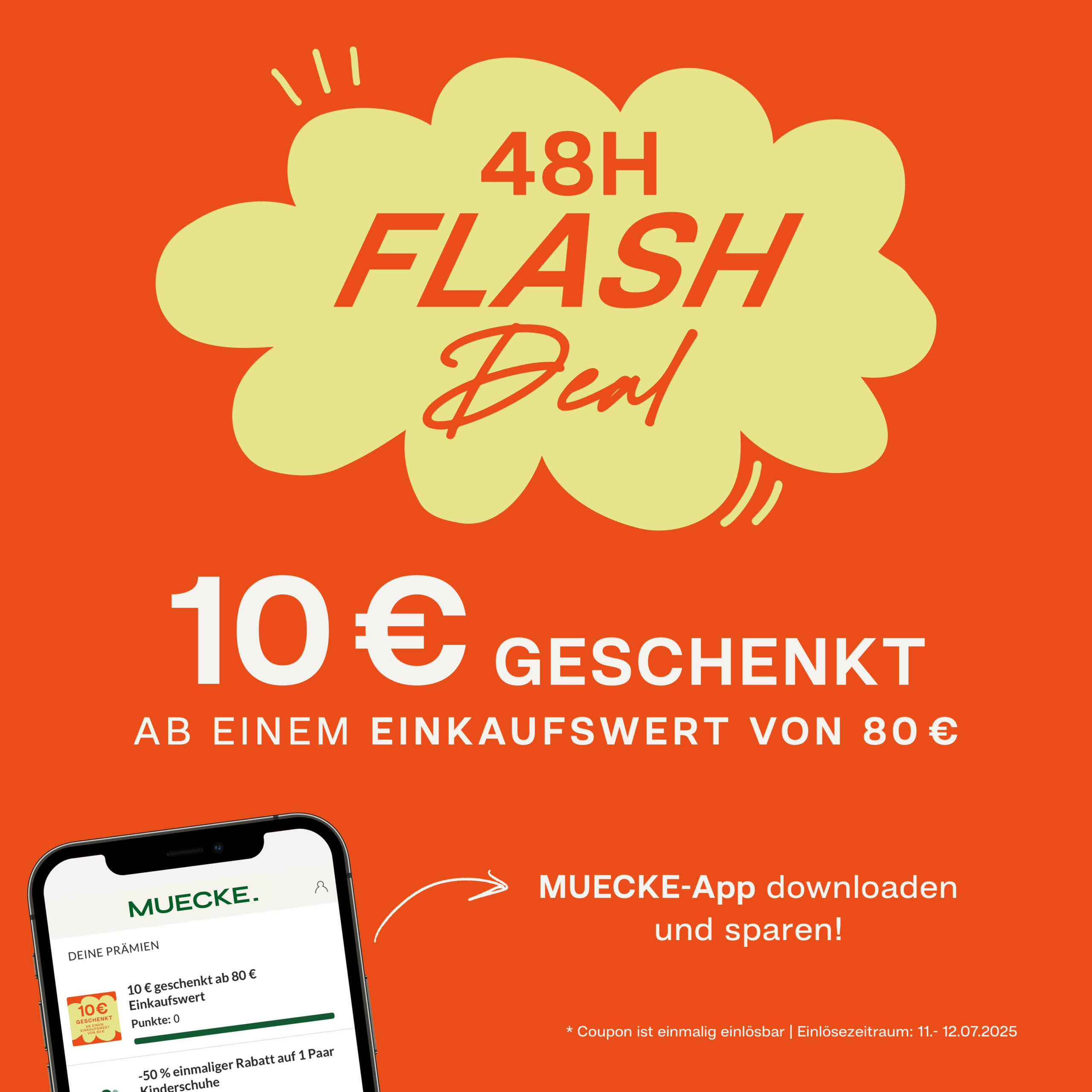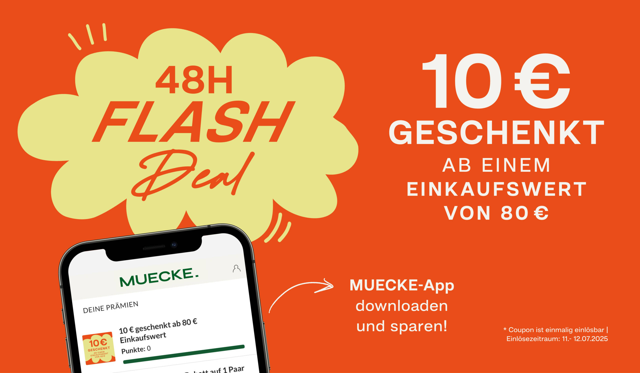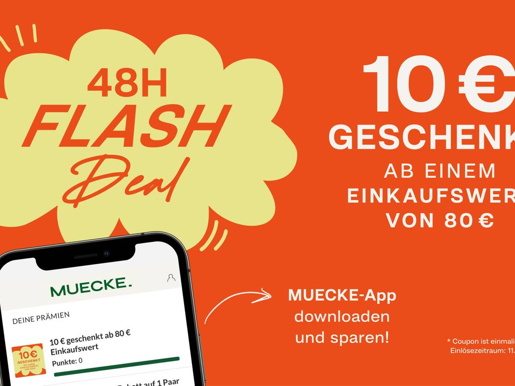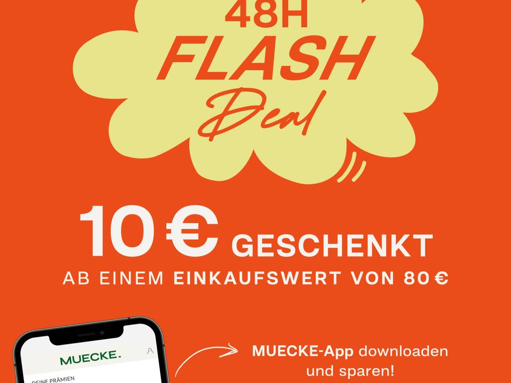 Ab einem Einkaufswert von 80 € schenken wir dir am 11.07. und 12.07. 10 € mit der MUECKE-App. Einfach die Prämie an der Kasse vorzeigen und sparen.