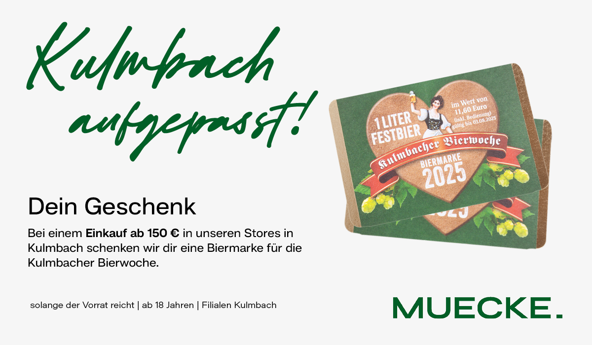 Passend zur Kulmbacher Bierwoche schenken wir dir zu deinem Einkauf ab 150 €* in unseren beiden Stores in Kulmbach eine Biermarke im Wert von 11,60 €.