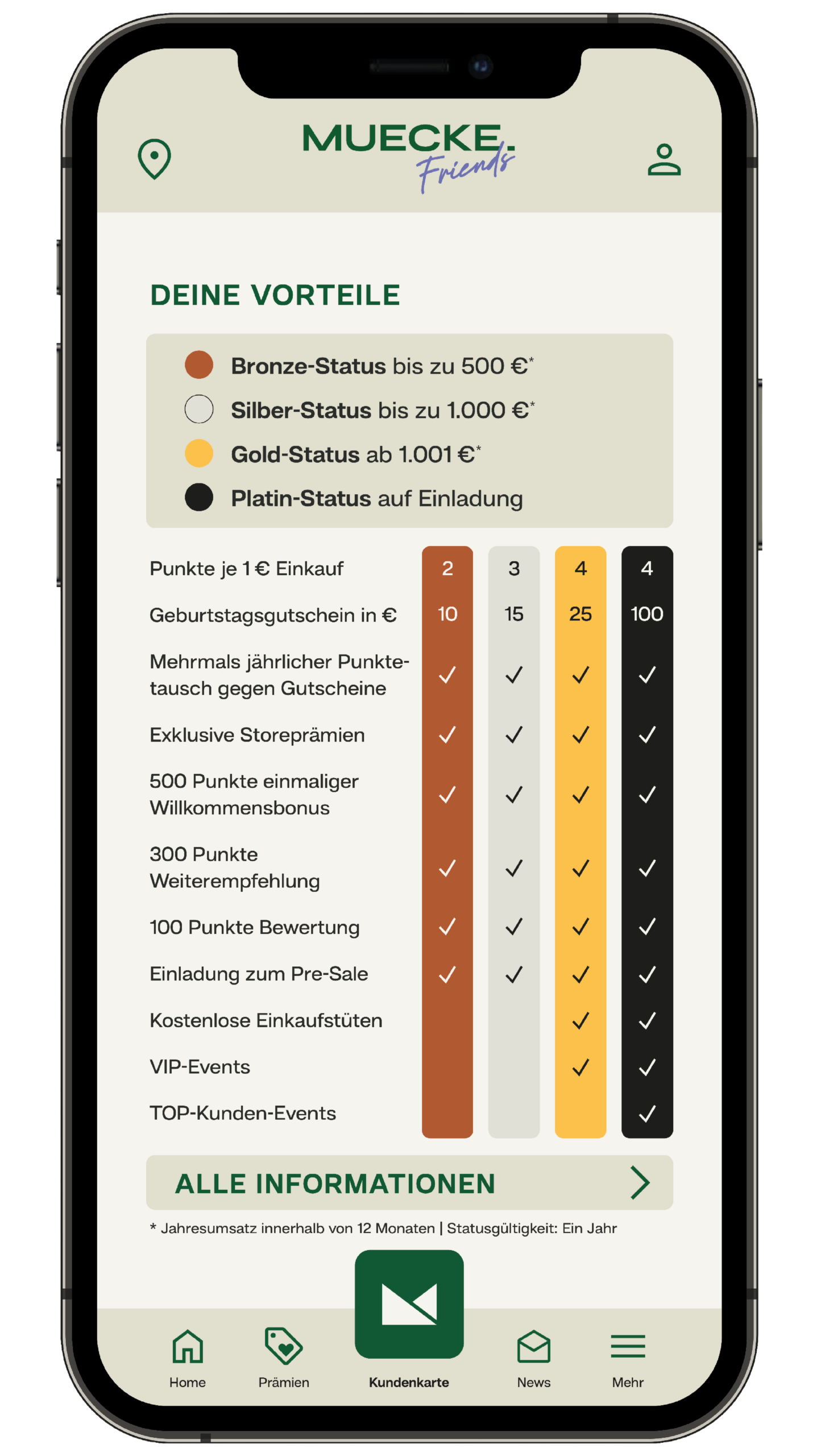 Freu dich auf exklusive Prämien, Rabatte, Events und viele weitere Highlights. Mit der kostenlosen App sammelst du bei jedem Einkauf Punkte und erreichst Schritt für Schritt neue Statusstufen – mit zusätzlichen Vorteilen. Als Willkommensgeschenk erhältst du nach deinem ersten Einkauf 500 Punkte*. Außerdem erwartet dich ein exklusiver Geburtstagsgutschein. Entdecke jetzt alle Vorteile von MUECKE Friends.
